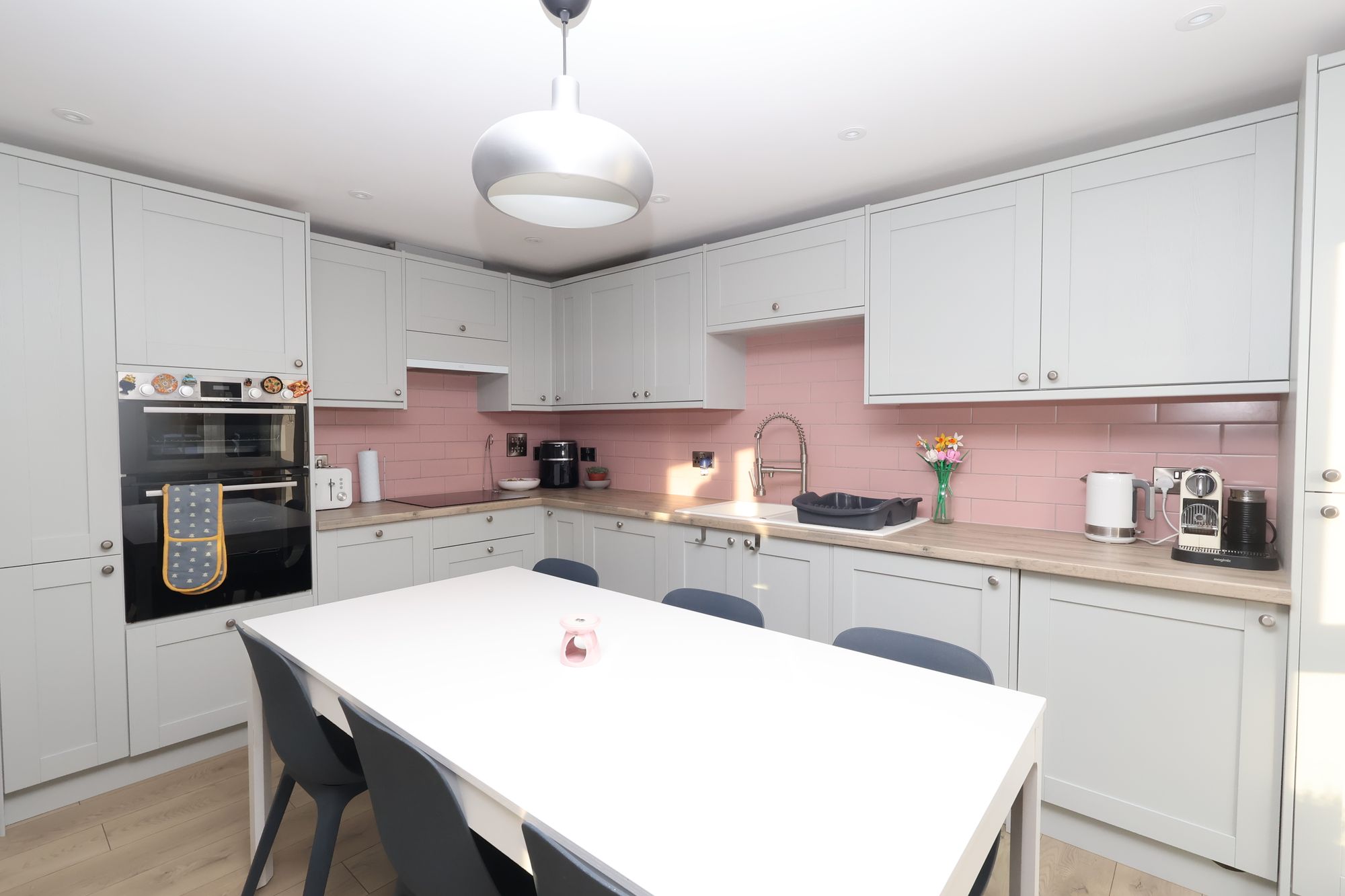 The property features a large, bright open-plan living area that comfortably accommodates lounge, dining and kitchen area. The modern kitchen is fitted with integrated appliances and offers ample storage and worktop space, making it perfect for everyday living and entertaining. The room benefits from excellent natural light, creating an inviting and airy atmosphere throughout.