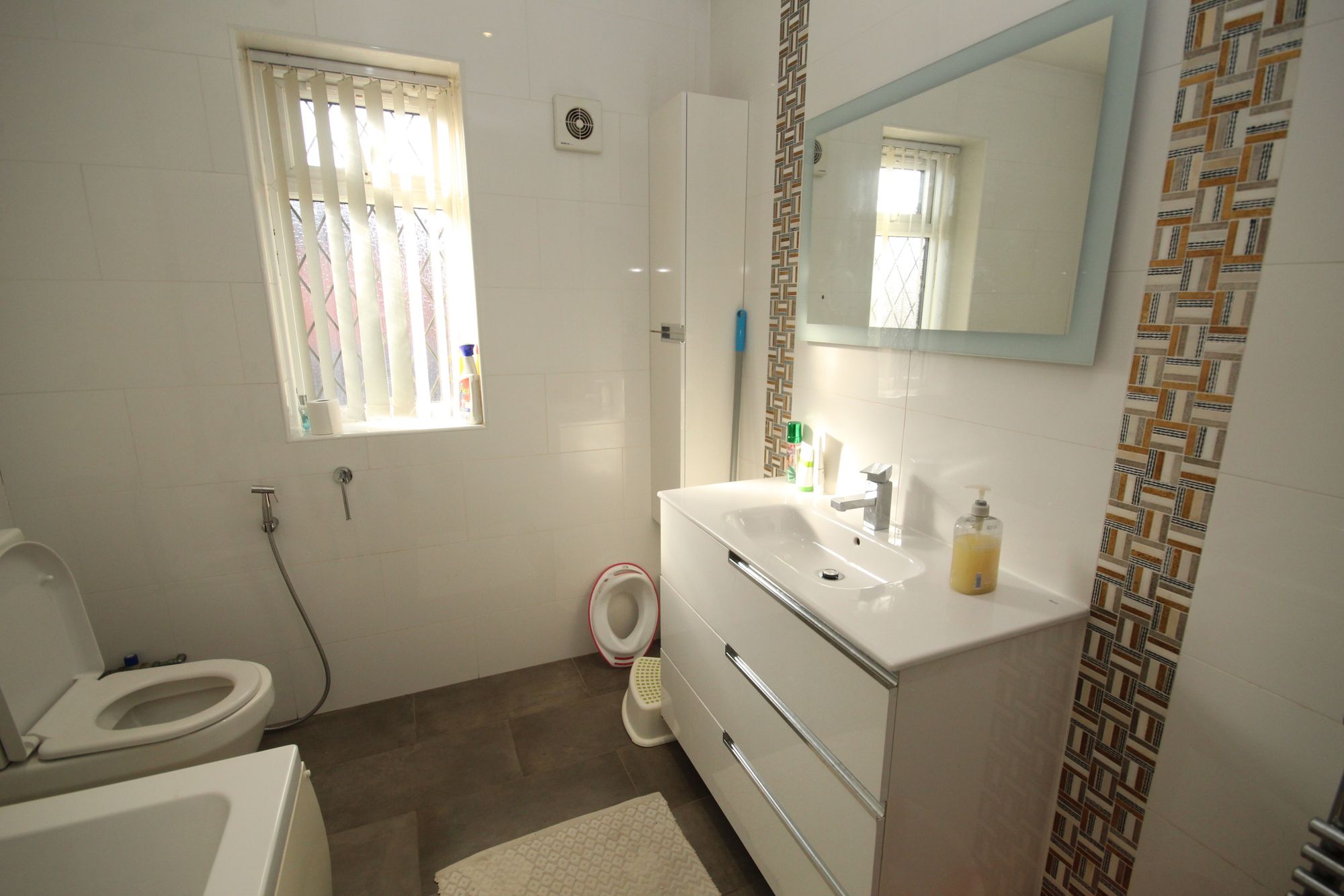 The family bathroom comprises a three-piece suite with a WC, vanity washbasin, and bath with a shower over, complemented by tiled flooring and a ladder radiator.